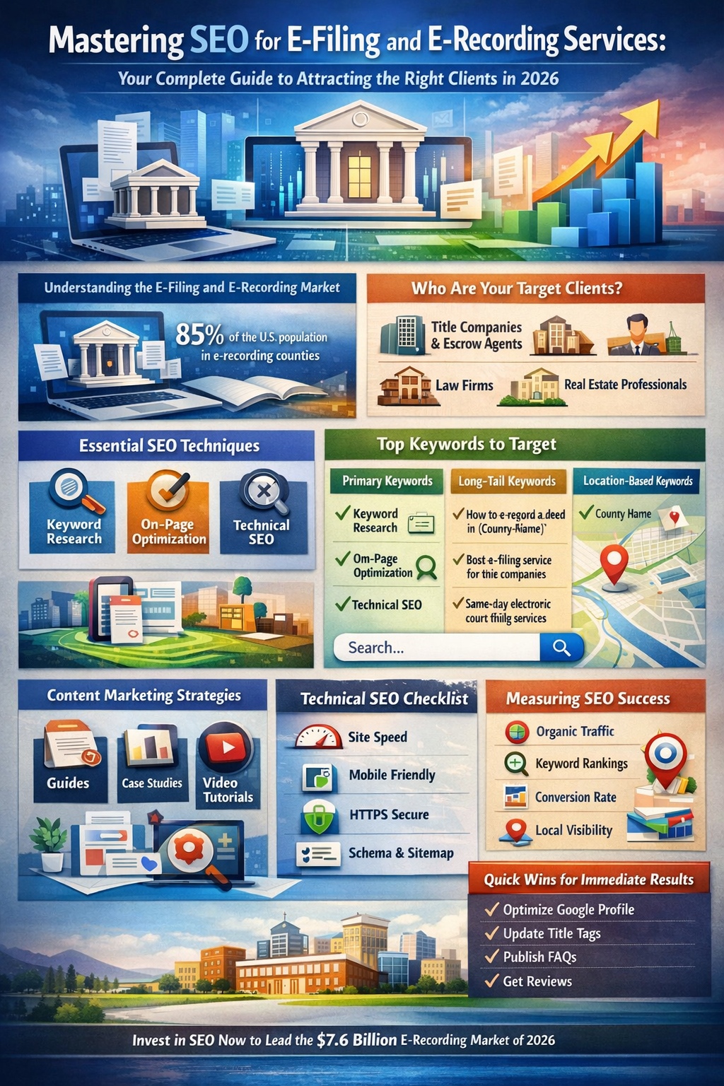 The e-filing and e-recording industry is poised for massive growth, but capturing that market share requires visibility. By implementing a robust SEO strategy that combines technical excellence, local optimization, and valuable content, you can position your business as the trusted authority in the digital recording space.